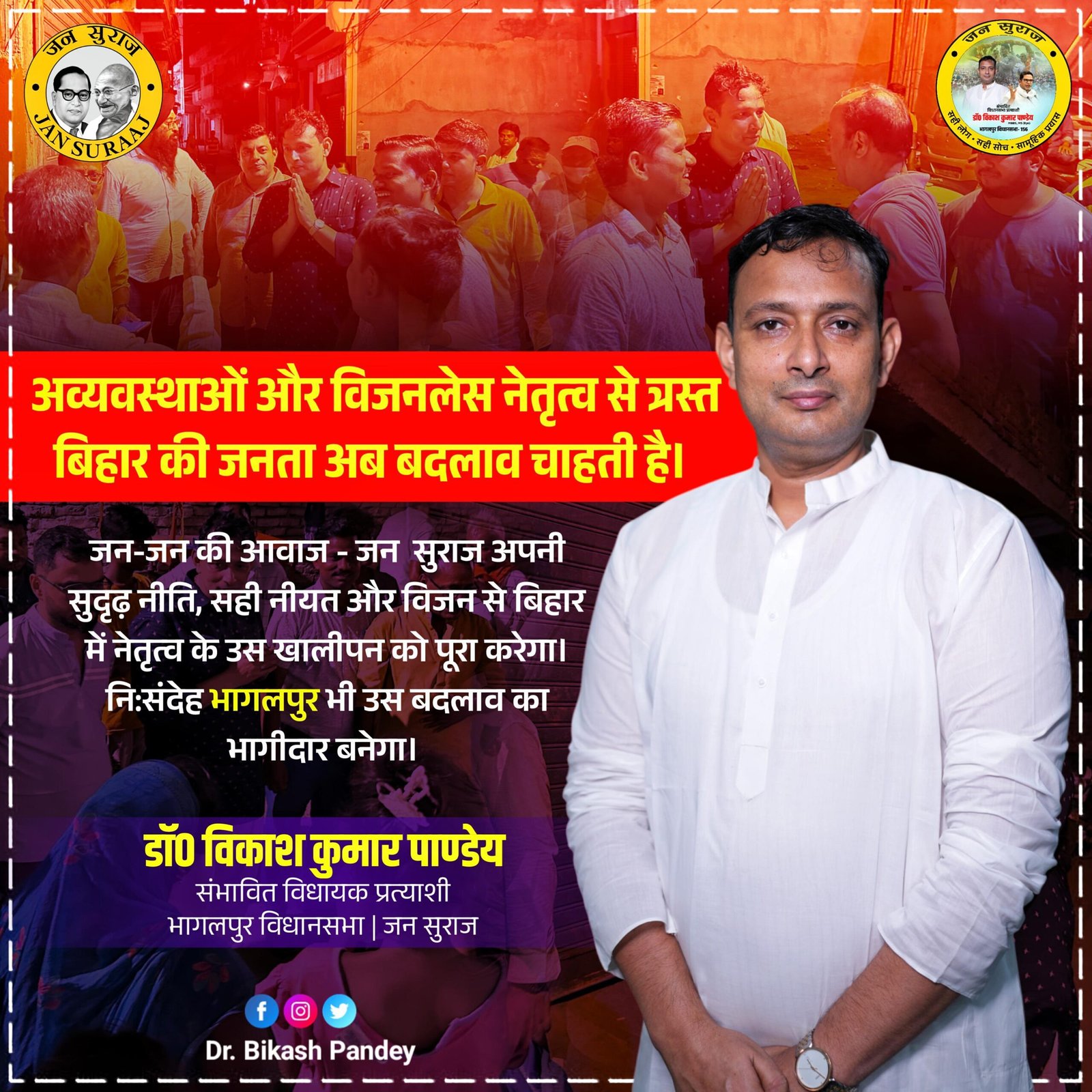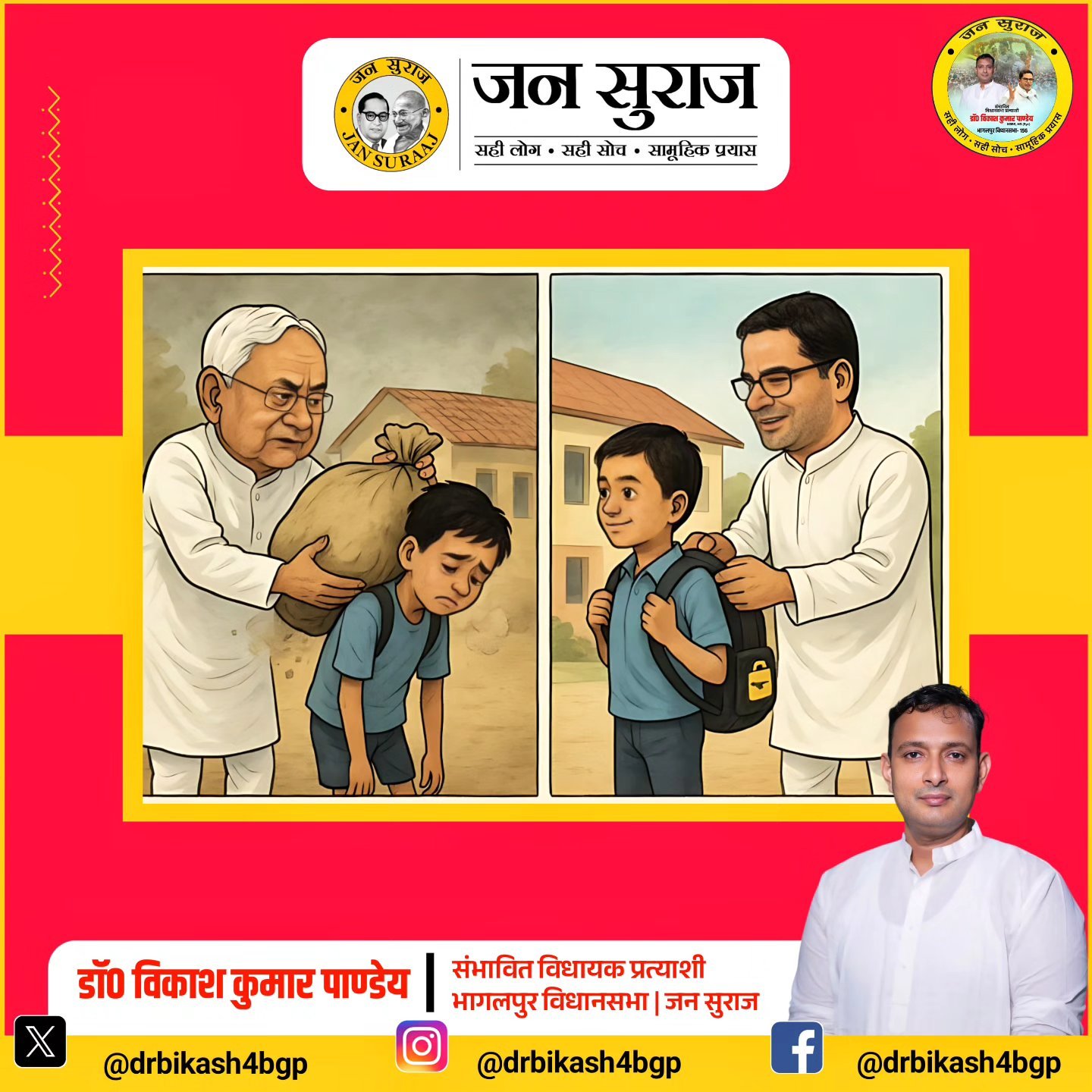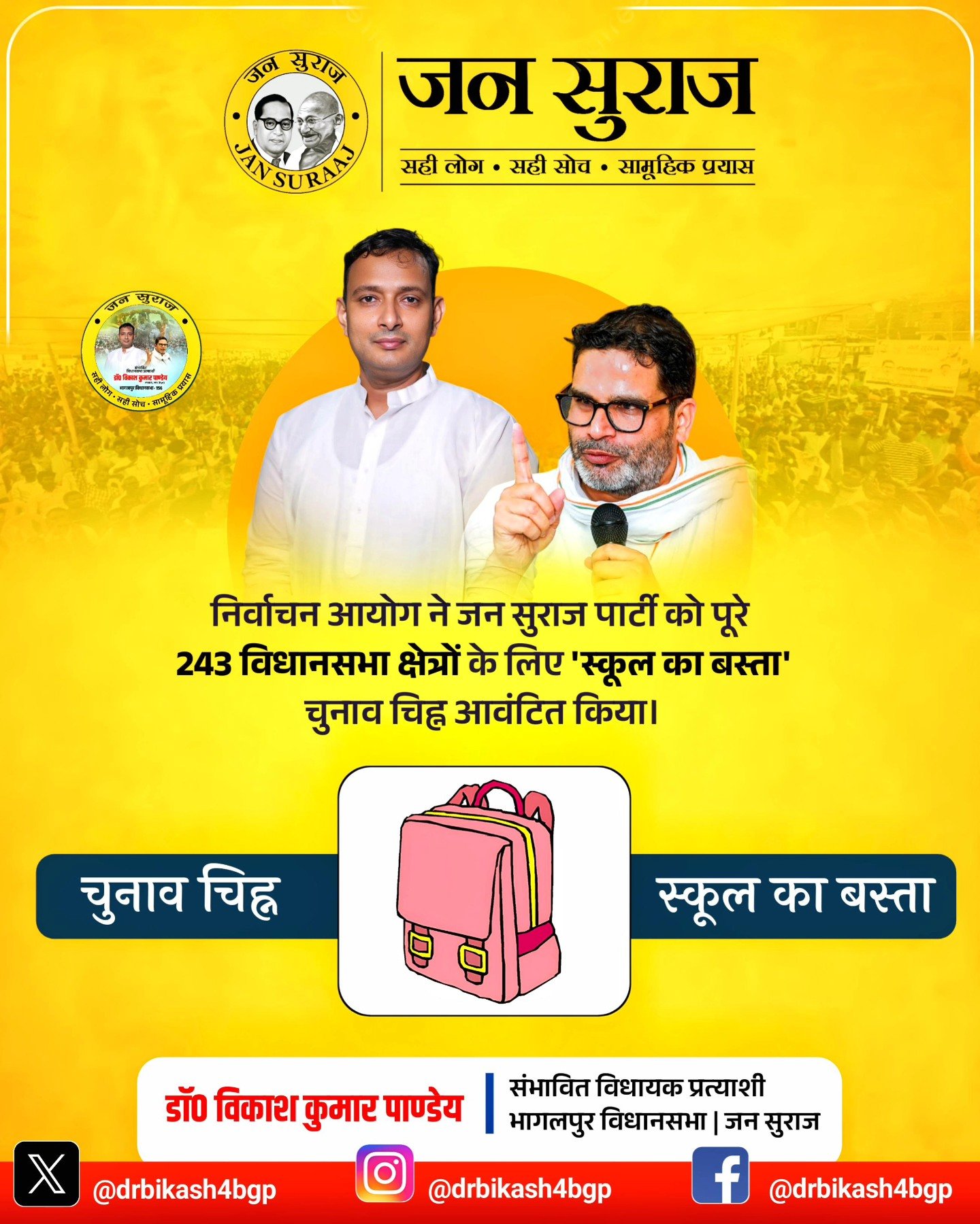 जन सुराज की लड़ाई विकास को वंशवाद से, नीति को निज़ी स्वार्थ से और जन-जन की आवाज को राजनीतिक जुमलेबाजी से मुक्त करने की ही है। इसके लिए आप सभी का साथ, सहयोग, विश्वास और आशीर्वाद चाहिए।